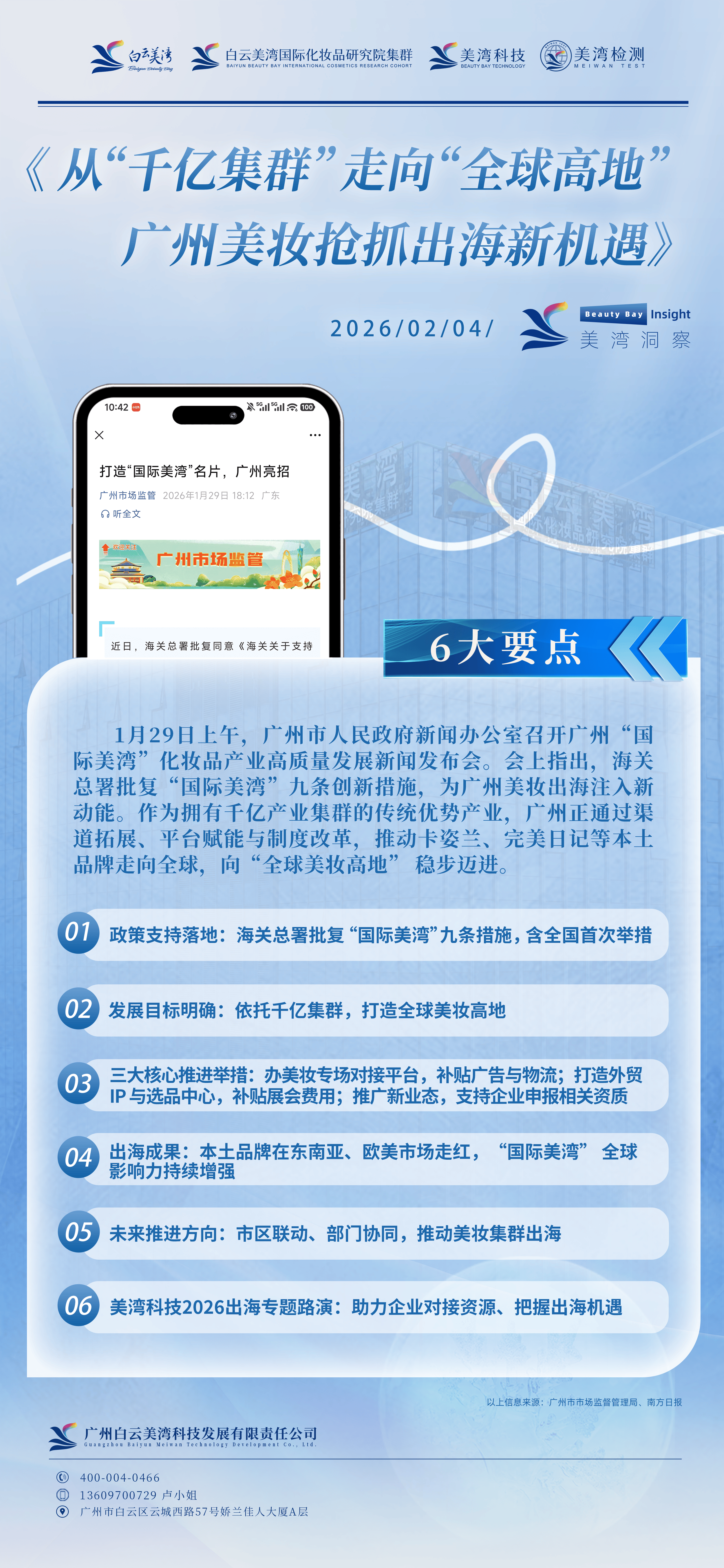 1月29日上午,广州市人民政府新闻办公室召开广州“国际美湾”化妆品产业高质量发展新闻发布会。会上指出,海关总署批复“国际美湾”九条创新措施,为广州美妆出海注入新动能。作为拥有千亿产业集群的传统优势产业,广州正通过渠道拓展、平台赋能与制度改革,推动卡姿兰、完美日记等本土品牌走向全球,向“全球美妆高地” 稳步迈进。对此,白云美湾国际化妆品研究院集群将全力支持配合,为出海企业提供从基础研发到成果转化的全链条科研支撑,助力本土品牌提升产品出海核心竞争力。
