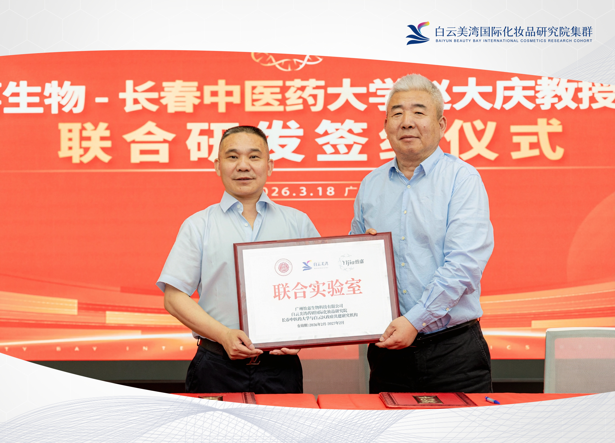 2026年3月18日,在广州白云美湾科技发展有限责任公司的推动下,广州怡嘉生物科技有限公司与广州市白云区白云美湾药妍国际化妆品研究院举行了联合实验合作签约仪式。
