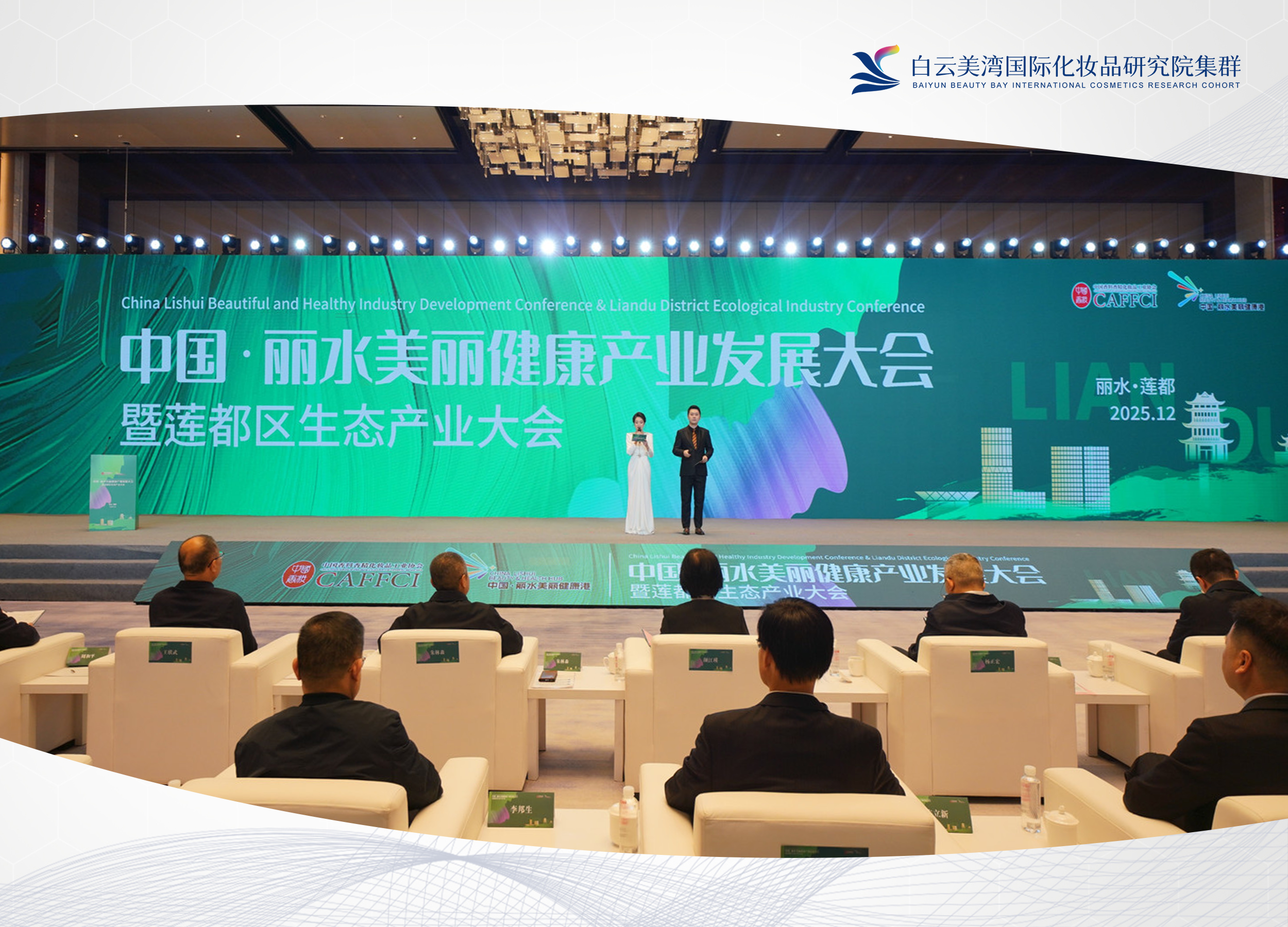 2025年12月29日至30日,【中国・丽水】美丽健康产业发展大会暨莲都区生态产业大会在浙江丽水莲都宝廷酒店成功举办,广州“白云美湾”代表、白美湾科技董事长蔡丙国先生受邀出席本次活动,与上海 “东方美谷”、济南 “北方美谷” 、湖州"美妆小镇"等全国知名美妆产业集群代表齐聚丽水,共同参与「美丽健康产业高质量发展共同体」启动仪式。