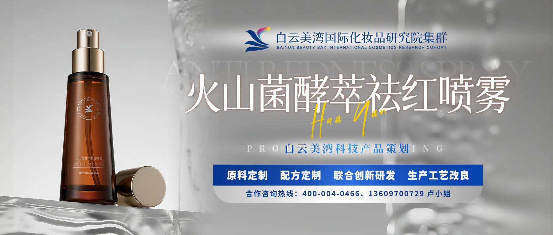 「火山菌酵萃祛红喷雾」60s速降温 15Mins快修项目后干红痒 使用白云美湾国际化妆品研究院集群自研核心原料: 1、「嗜热栖热菌发酵产物」 源于30亿年前远古时期的古菌种,被发现于意大利仙女泉泉眼,可耐受75度℃以上的高温。含有热休克蛋白,可稳定蛋白结构,对抗光热损伤。 2、「三黄舒敏植萃」 融合黄连、姜黄、当归、黄檗,生地黄,五味一体;灵感来源清乾隆《医宗金鉴》黄连膏,三篇自然科学基金项目论证其止痒、抗过敏、缓解热痛反应等舒缓功效。